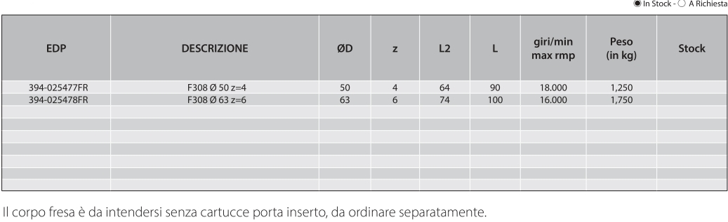 Il corpo fresa è da intendersi senza cartucce porta inserto, da ordinare separatamente.