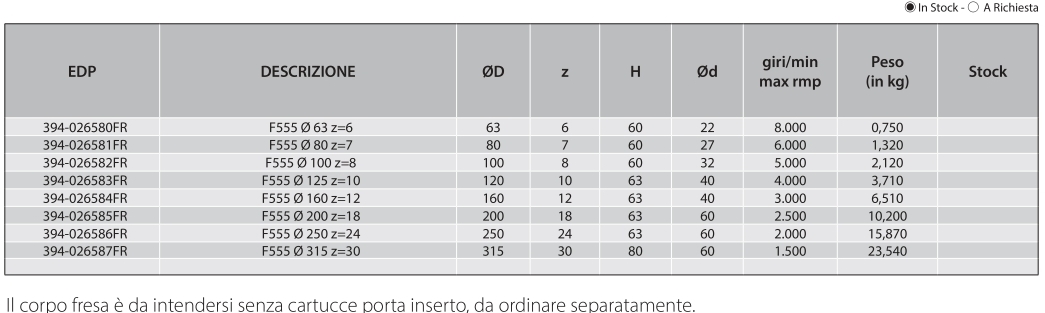 Il corpo fresa è da intendersi senza cartucce porta inserto, da ordinare separatamente.